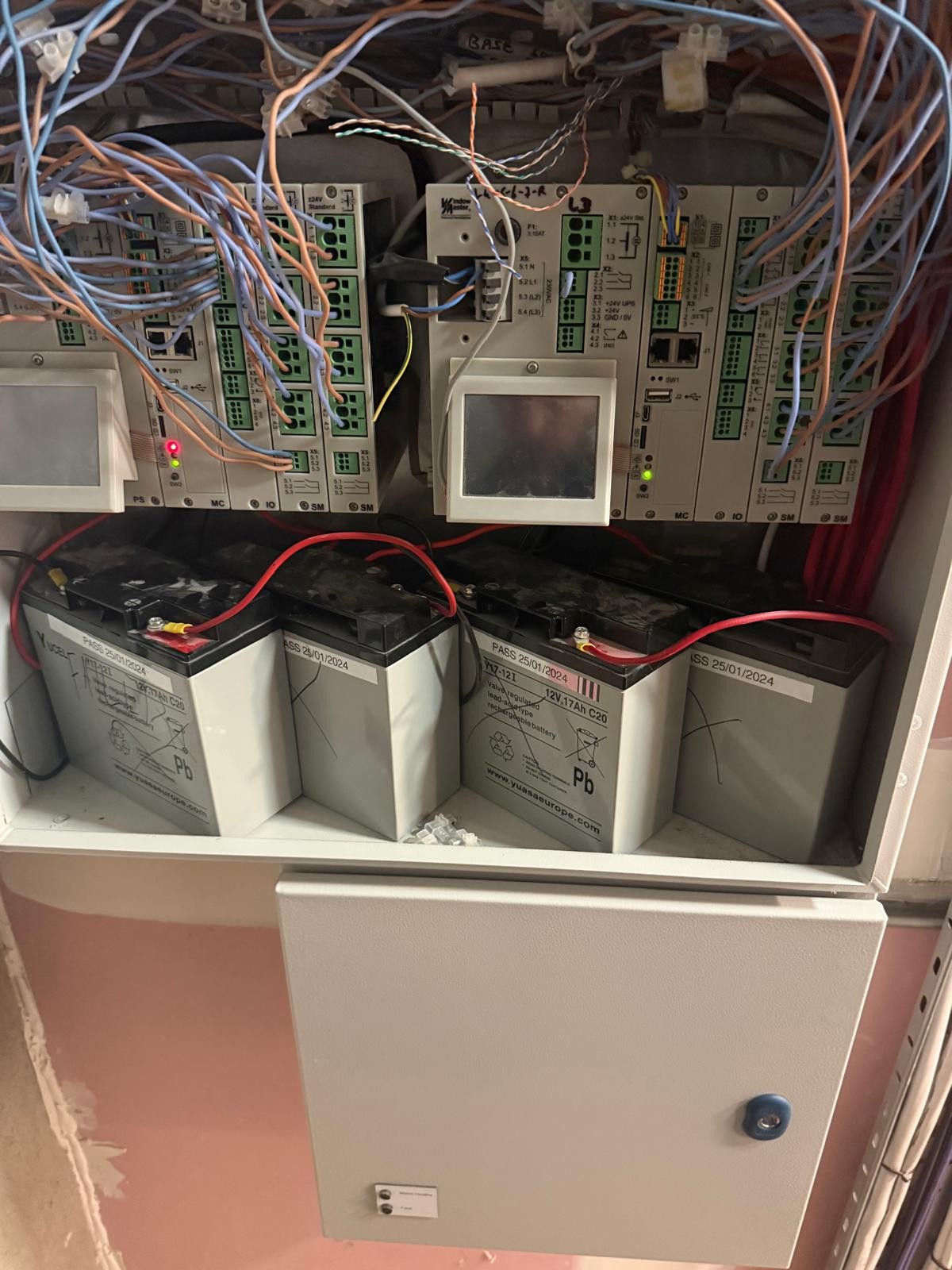 The existing batteries were safely removed and new 12V sealed lead-acid batteries installed to restore reliable standby power. Charging voltages and panel status indicators were checked, and the system was confirmed fully operational on completion.
